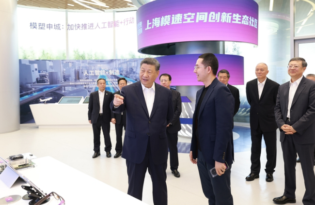 4月29日,中共中央總書記、國(guó)家主席、中央軍委主席習(xí)近平在上海考察。這是習(xí)近平在位于徐匯區(qū)的上海“模速空間”大模型創(chuàng)新生態(tài)社區(qū),聽取相關(guān)技術(shù)研發(fā)和企業(yè)生產(chǎn)經(jīng)營(yíng)介紹。新華社記者 王曄 攝