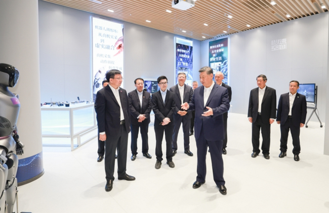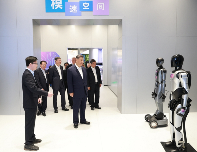 4月29日,中共中央總書記、國(guó)家主席、中央軍委主席習(xí)近平在上海考察。這是習(xí)近平在位于徐匯區(qū)的上海“模速空間”大模型創(chuàng)新生態(tài)社區(qū)人工智能產(chǎn)品體驗(yàn)店考察。新華社記者 謝環(huán)馳 攝
