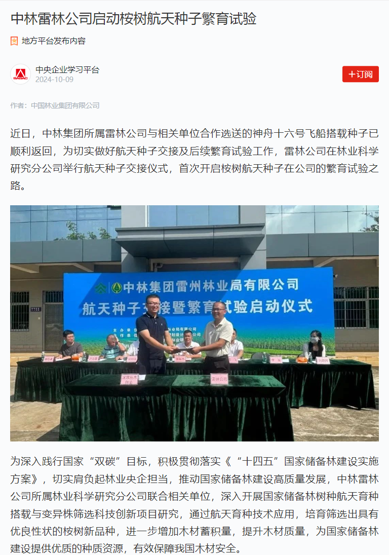 近日,“學習強國”學習平臺報道中林雷林公司啟動桉樹航天種子繁育試驗,現將報道全文分享如下: