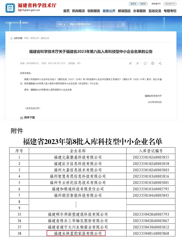 近日,福建省科學技術廳公布福建省2023年第8批入庫科技型中小企業名單,中林集團所屬永安林業下屬公司——福建永林藍豹家居有限公司成功入選。