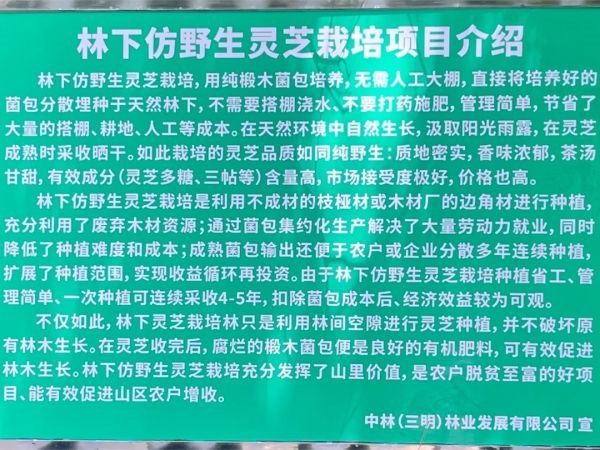 中林三明公司積極探索共享林下經營模式,充分利用林下中藥材多花黃精種植先驅經驗,于2023年5月中旬在將樂縣??诖宥嗷S精種植基地套種仿野生椴木紫靈芝,打造了集多元化于一體的小型循環生態系統基地,共完成種植3000余株,以點帶面,將逐步擴大種植面積,成為輻射周邊地區的示范基地。現種植的仿野生椴木紫靈芝部分已進入成熟期,后續將陸續開展靈芝的采收工作。