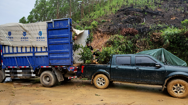 梧州事業部職工用自己的皮卡車運苗卸苗
