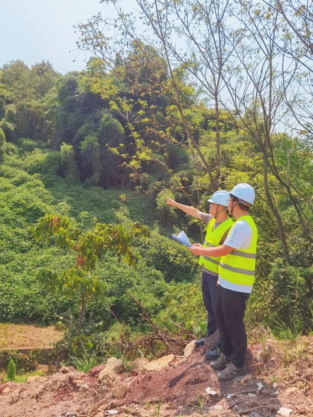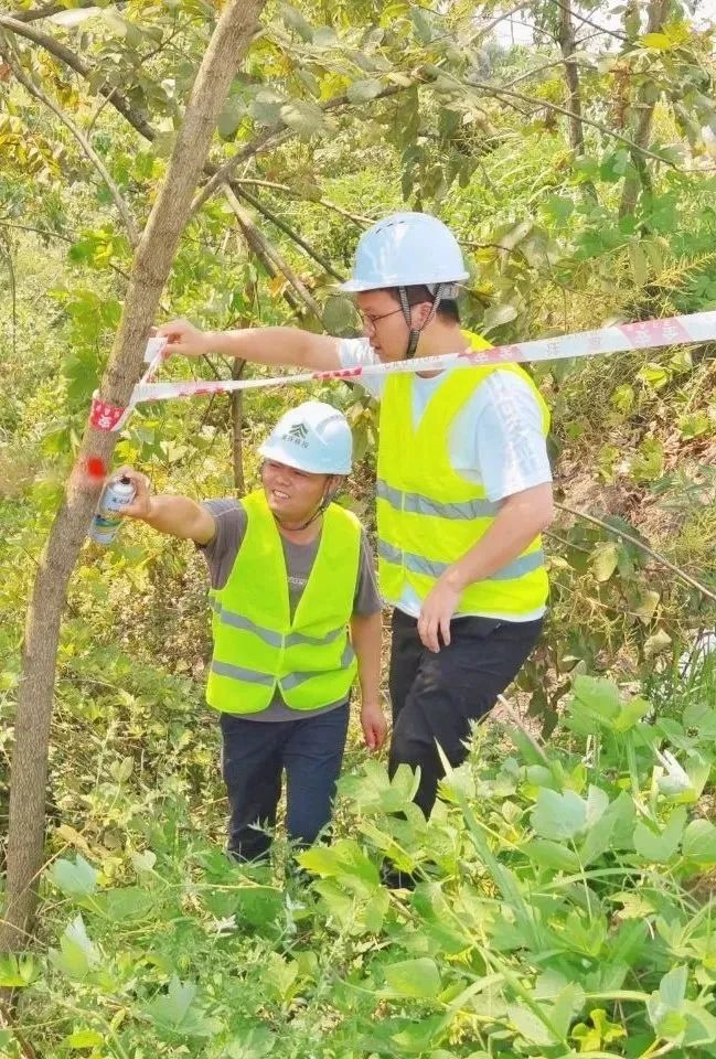 淬火鑄鐵軍,青山證丹心。那段時間銅梁區(qū)連續(xù)高溫預(yù)警,項目部青年突擊隊成員鄒峰嵐和吳雪民作為黨員,沖鋒在前,持續(xù)在“炙烤模式”中澆筑綠色屏障——他們充分利用施工空窗期,為防火隔離帶中的珍貴闊葉樹系上“生態(tài)身份證”,在蒸騰熱浪中為每寸山林鐫刻守護坐標。