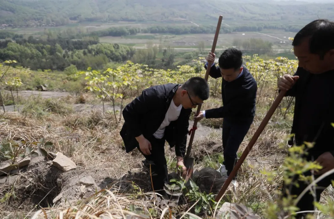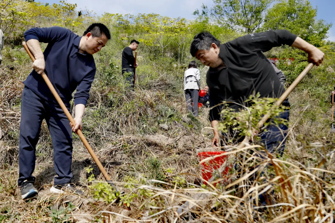 4月12日上午,在河南信陽淮河上游天目山退化林補植修復項目現場,集團公司黨委書記、董事長、總經理單忠立,黨委委員、副總經理李留彬,信陽市委常委、副市長李俊和大家三五一組,手持鐵鍬、水桶等工具來到植樹區域,揮鍬刨坑、扶苗培土、提水澆灌、平整踩實……大家悉心栽種著黑松、麻櫟等苗木,現場一派熱火朝天的景象。經過一個多小時的辛勤勞動,一株株“新生”的苗木“安家落戶”,在微風吹拂下,煥發出勃勃生機。